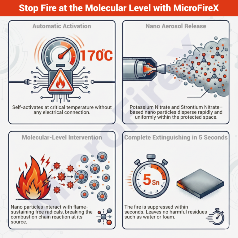 It automatically activates when the ambient temperature reaches 170°C, requires no electrical connection, and extinguishes the fire in just 5 seconds. It leaves no residue like water or foam, and does not harm electronic devices.